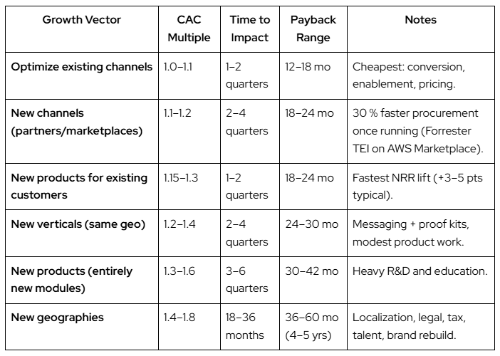 That’s the high-efficiency growth play most operators underestimate. If you can introduce a new product to your existing base, your CAC might increase 20–30%, but your payback shortens as NRR climbs. That CAC increase might come from investments in enablement or new sales motions. But it’s also possible CAC itself doesn’t move at all. It’s the one vector that compounds instead of dilutes.