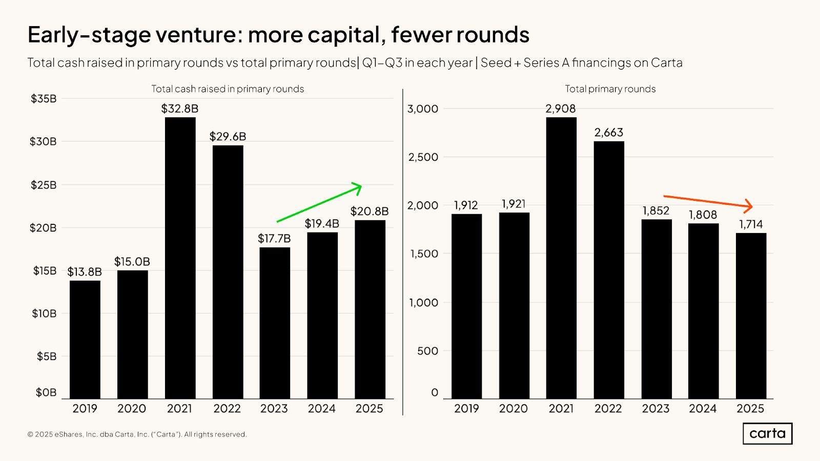 More dollars are flowing into startups but fewer companies are actually raising rounds (at least within the early stage). So each investment is slightly more consensus.