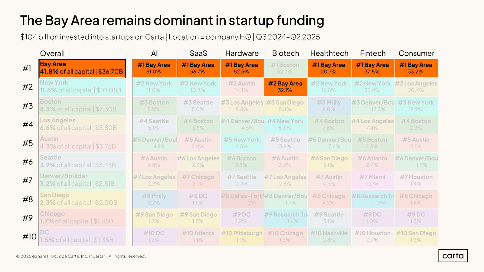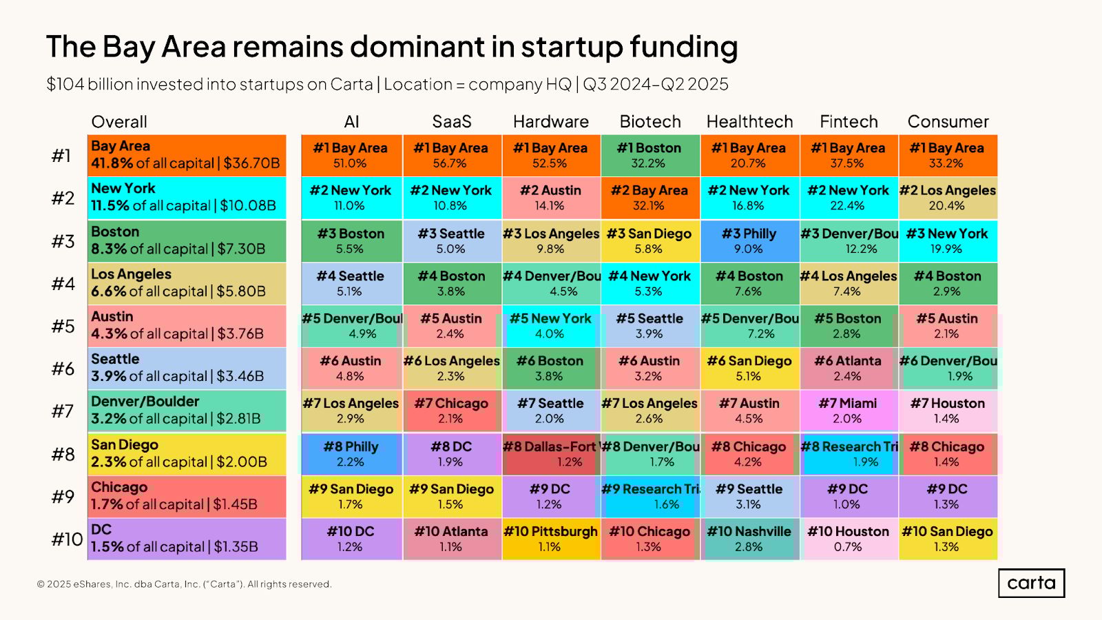 So we have three separate thematic concentrations occurring at the same time. Investors are zeroing in on AI startups, investing more money in fewer companies, and doing so primarily in the Bay.