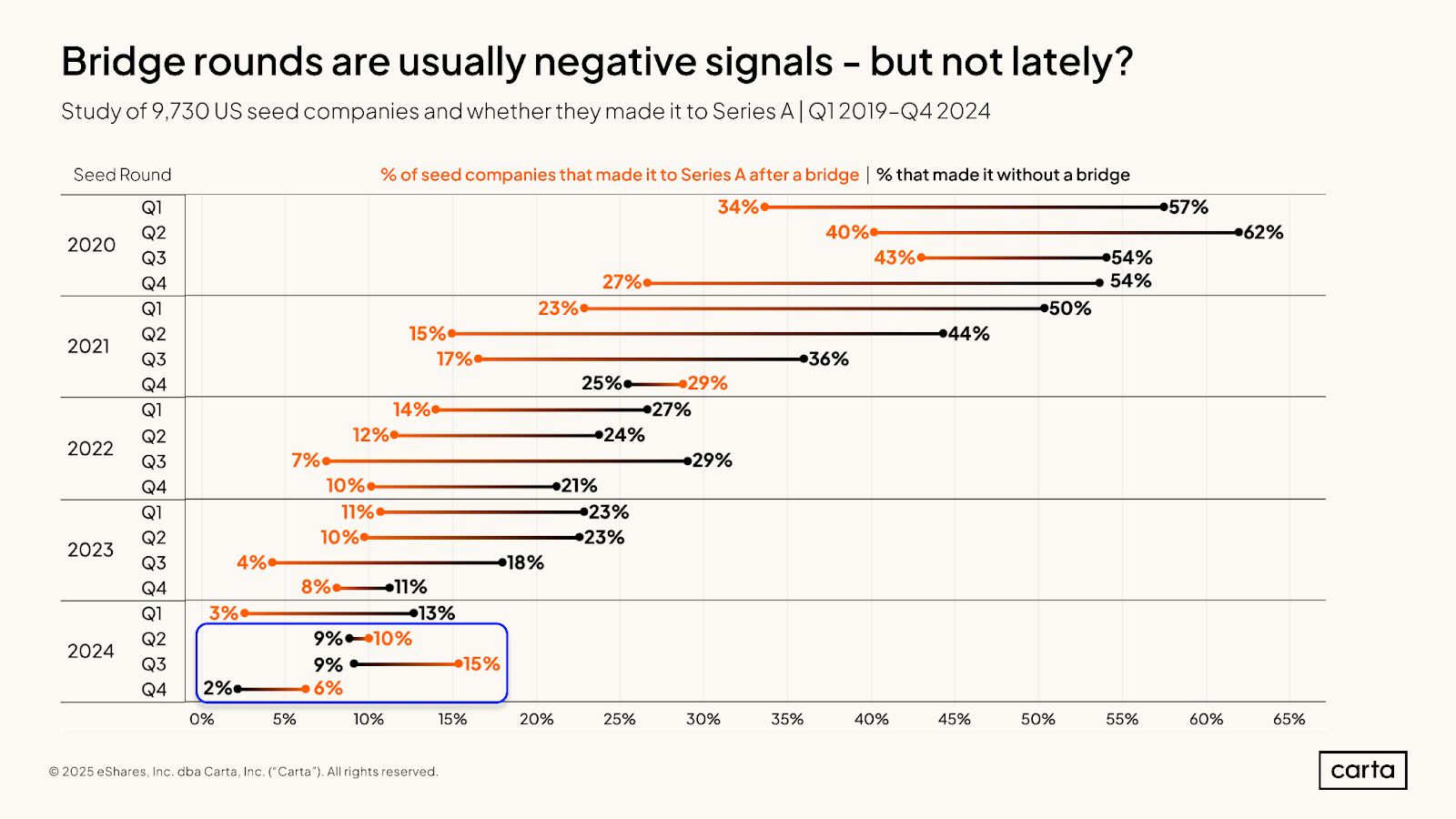 And that’s what the data shows, by and large. Companies that needed a bridge (in orange) graduate to the next round less often that companies that don’t (in black)…except in the most recent quarters, where the dynamic is flipped.