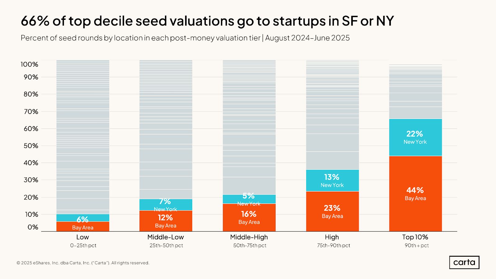 The chart shows that 44% of the startups that raised in the top decile of seed valuations are in the Bay. Basically if you are only trying to optimize for the highest valuation (which is not a great idea, to be clear) you effectively have to move to SF.