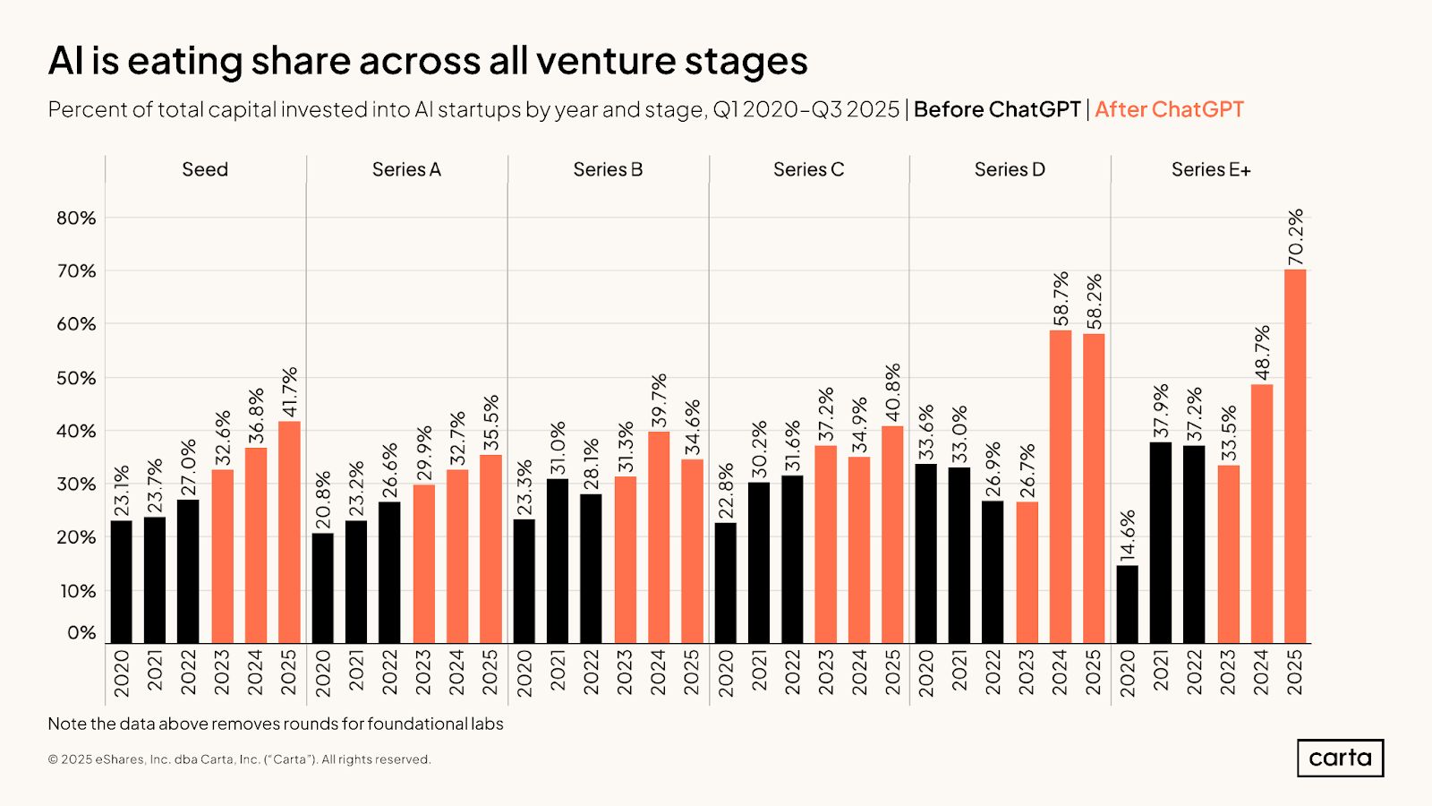 AI, AI, AI. These “AI dominance” charts are starting to bleed together but just because the message is annoyingly overplayed doesn’t make it wrong. More VC capital is flowing to AI companies across basically every single stage of venture.